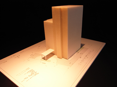 Ultra respect can be produced by squeezing one side in respect while using a straight line aluminum lattice. The movement of the vertical direction or more can be given by giving the torque to the tower shape in the vertical direction, and a simple, symbolical silhouette can be drawn.