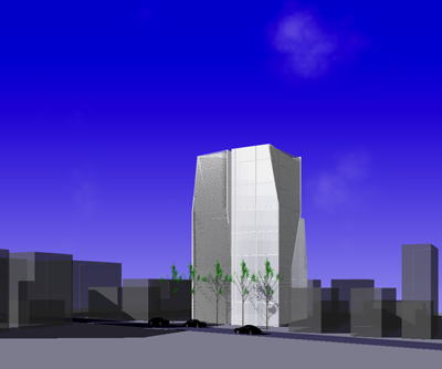 東京都心部に計画されたデザインマンションプロジェクトでは、常に過不足ないデザインインパクトをもとめられる。ノーマルなボリュームから貸室面積を減らすことなく話題性を持つデザインが要求される。用途地域をまたぐ敷地をボリュームでも分断し、さらに2分割して4つのコラム状のけいじょうとすることでスレンダーなタワー状の形状を強調し、そのバルコニー部分に1m巾から2m巾まで変化をつけることで、回転して上昇していくシェイプをデザインした。直線のアルミ格子を用いながら面の一方を絞っていくことで、双極面を作り出すことができる。垂直方向のタワー形状に対してトルクを与えることでより垂直方向の動きを与えることができ、シンプルで象徴的なシルエットを描くことができる。